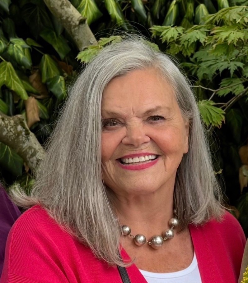 ID: Marilyn, a white woman with long gray hair, smiles at the camera. She is wearing a red top and a beaded necklace, framed in a circular image with a teal border against a leafy background.