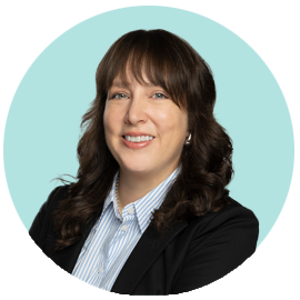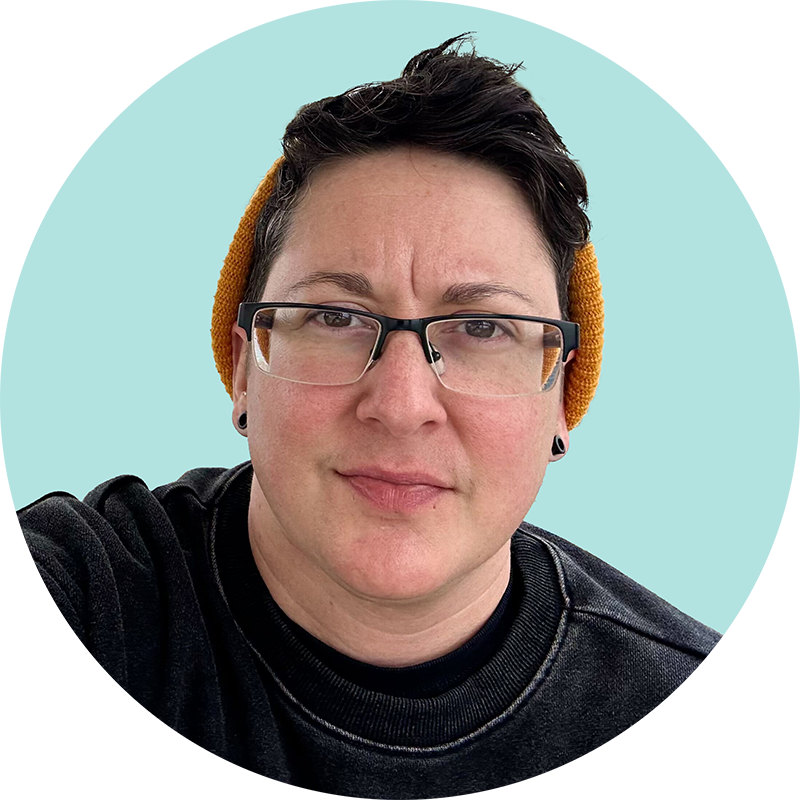 ID: Avi, a smiling white woman with long brown hair, is wearing a light pink sweater and clear-rimmed glasses, with a teal backdrop behind her.