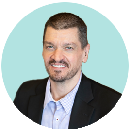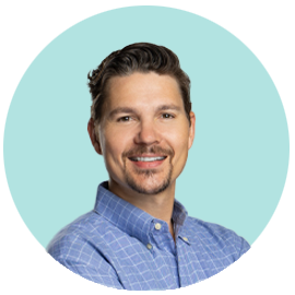 ID: Chris, a white man, is wearing a dark gray polo and is smiling. Behind him is a teal backdrop.