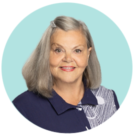ID: Marilyn, a smiling white woman with pink lipstick, has shoulder-length grayish-blonde hair and is wearing a black and white striped shirt. Behind her is a teal backdrop.