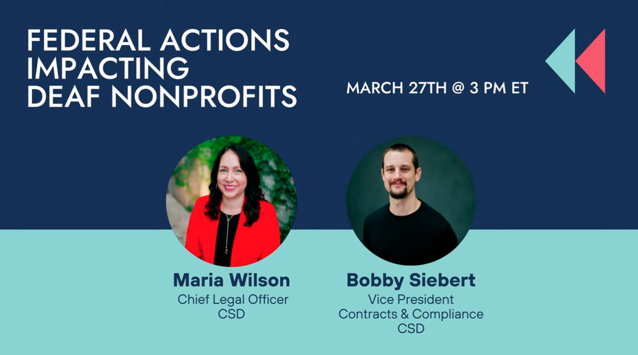 The “Federal Actions Impacting Deaf Nonprofits” webinar on March 27, 2025, was led by Maria Wilson and Bobby Siebert, legal and compliance experts from CSD. The presentation covers how the Executive Orders, including those ending DEIA-related work, and potential changes to Section 504 under the Trump Administration may affect deaf nonprofits.